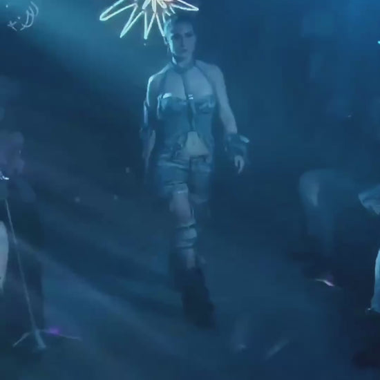 These feminine deconstructed denim pants feature asymmetrical panels, raw hems, and looped details. Lower leg sections detach easily via soft denim ties, converting the look from full-length pants to edgy shorts. Designed for dynamic wear—functional, fashion-forward, and sustainably built.