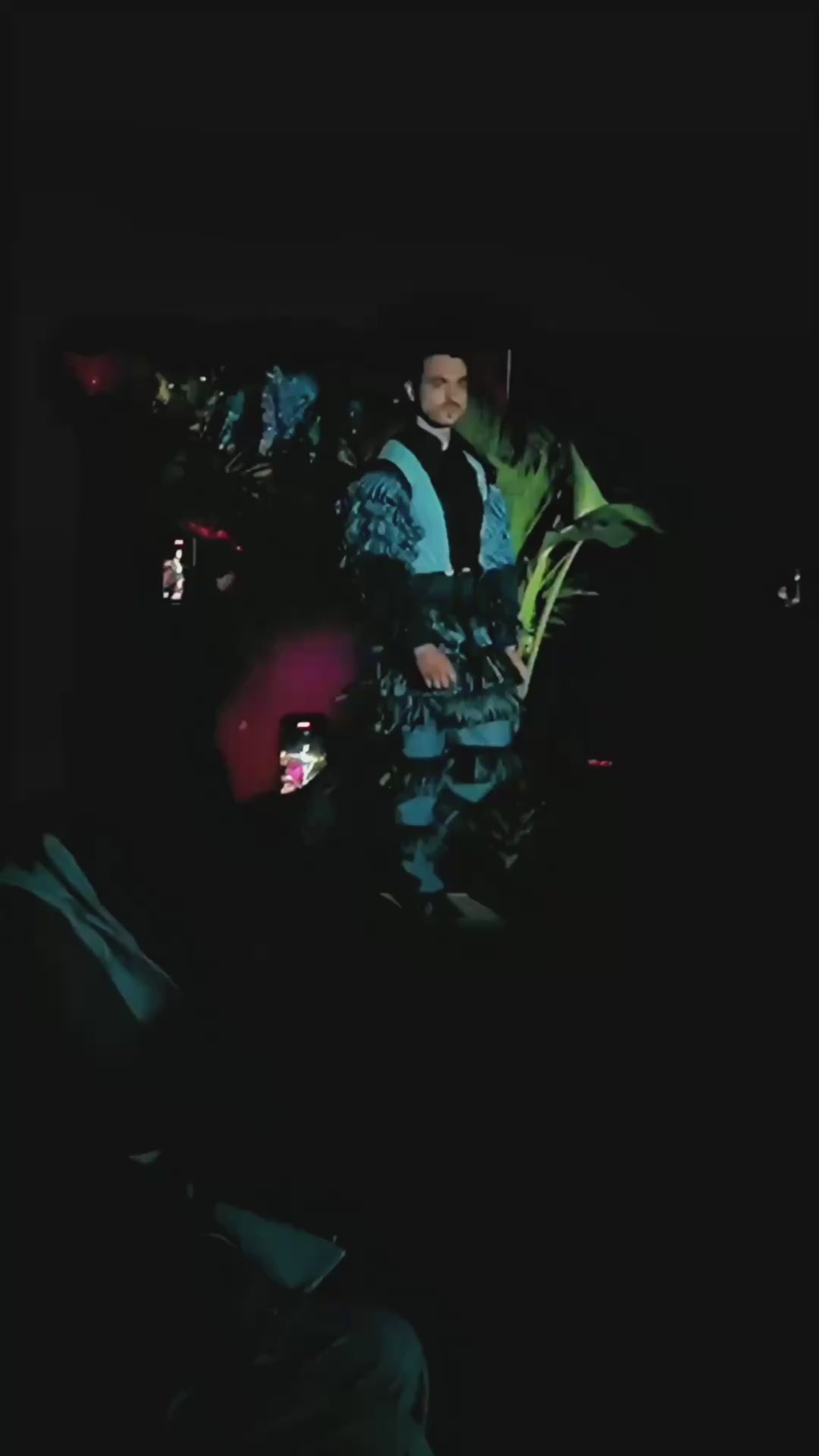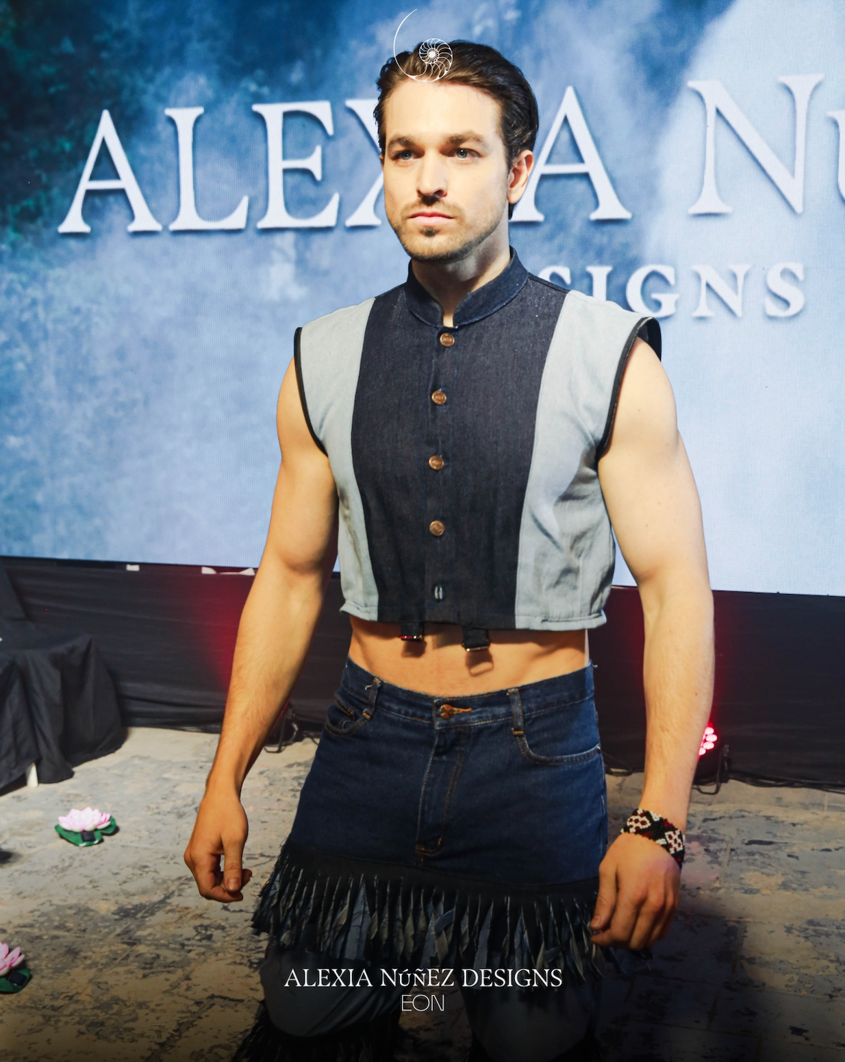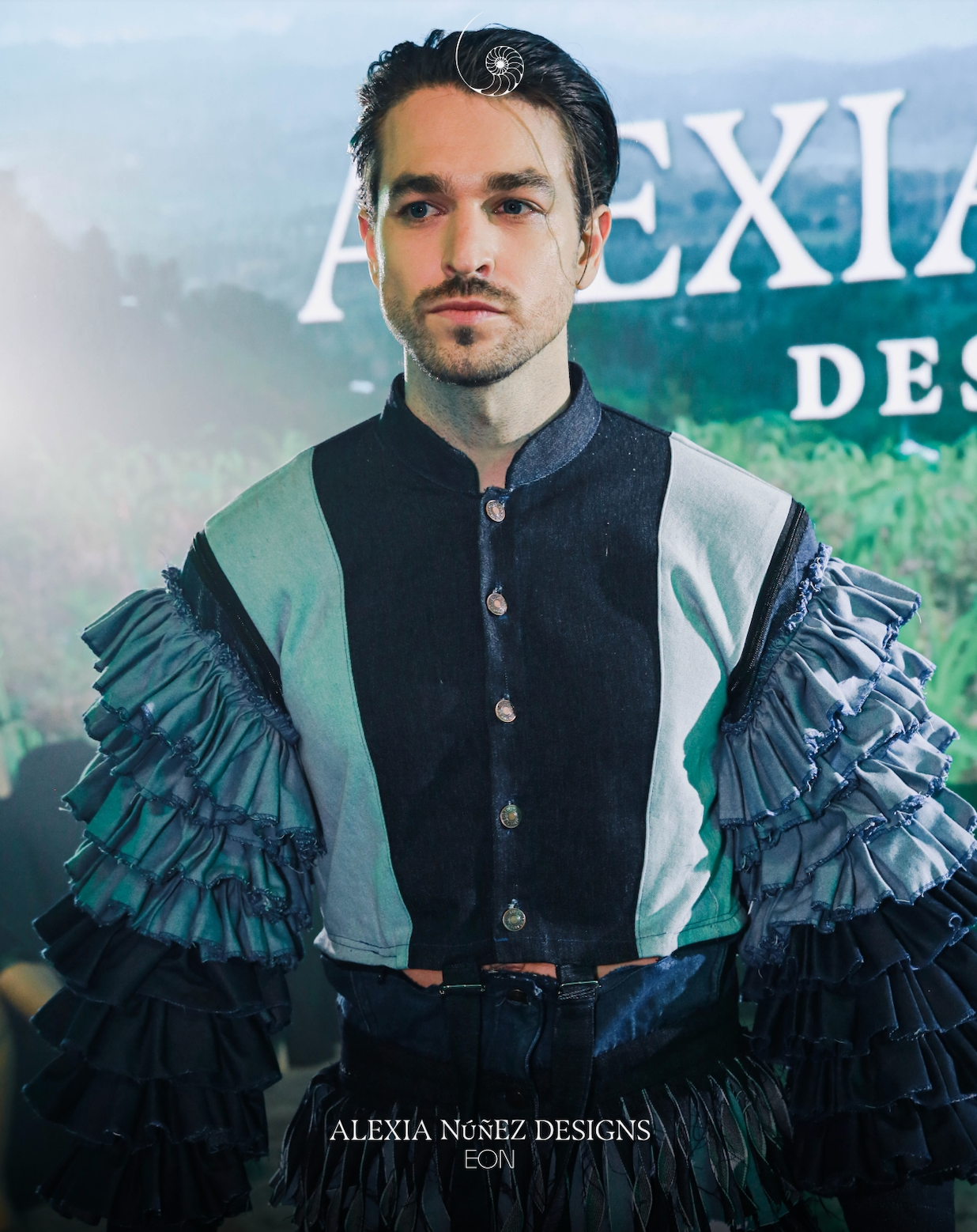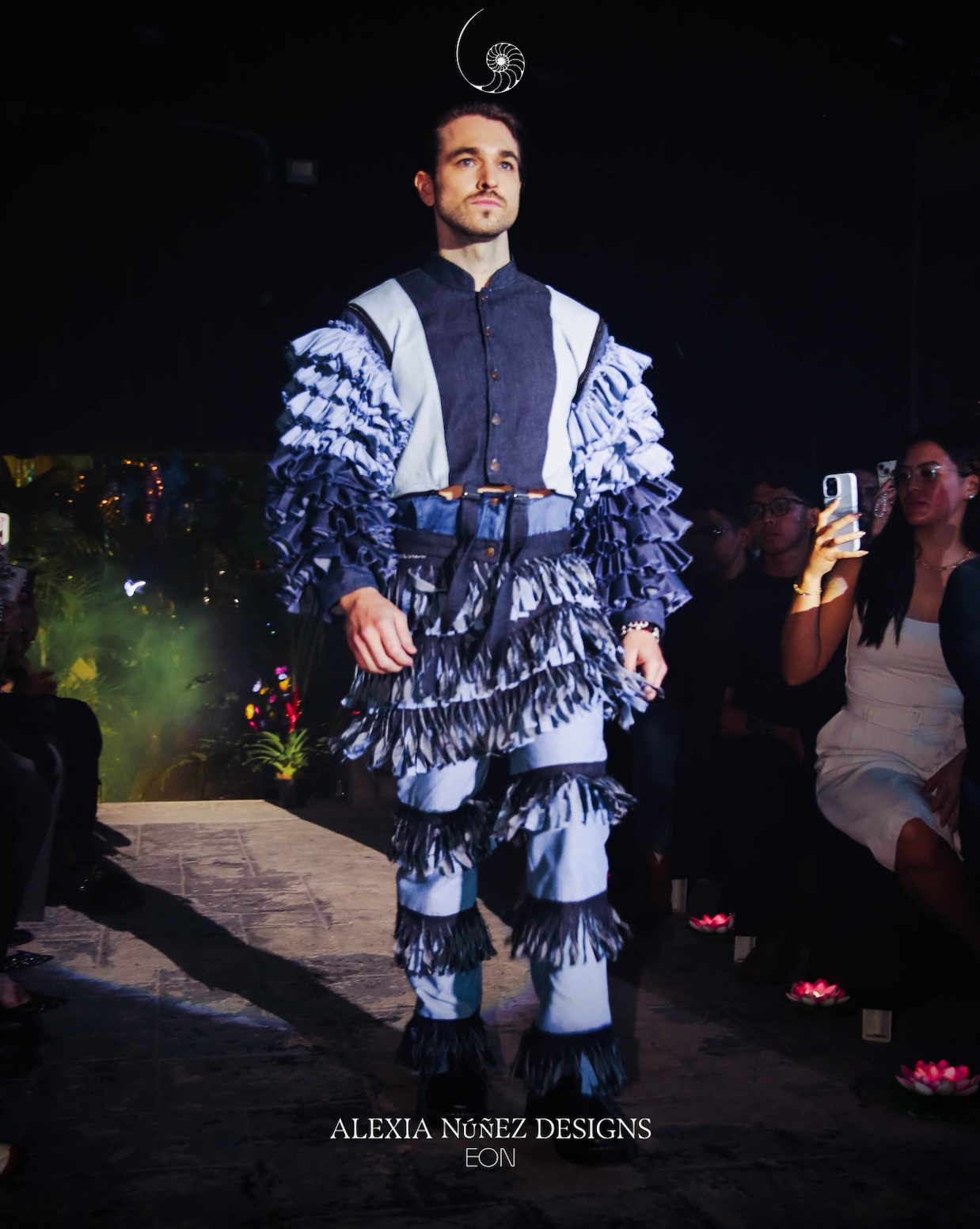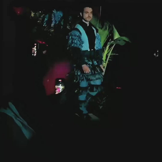 This couture unisex top reimagines silhouette and motion with a high-collar denim bodice and explosively tiered sleeves. Constructed from multiple shades of reclaimed denim, each ruffle is individually hand-sewn to create volume and drama while retaining a structured form through the torso. A center button-down closure and color-blocked paneling anchor the look in precision tailoring.