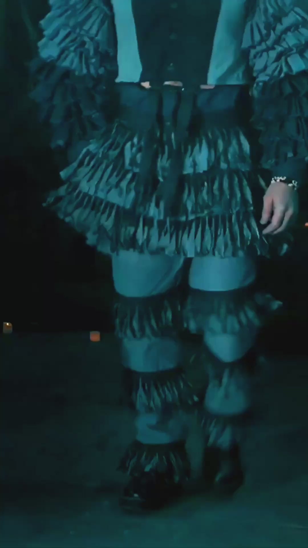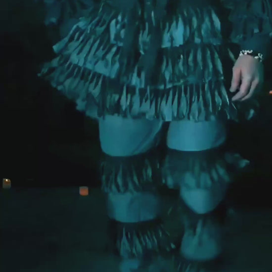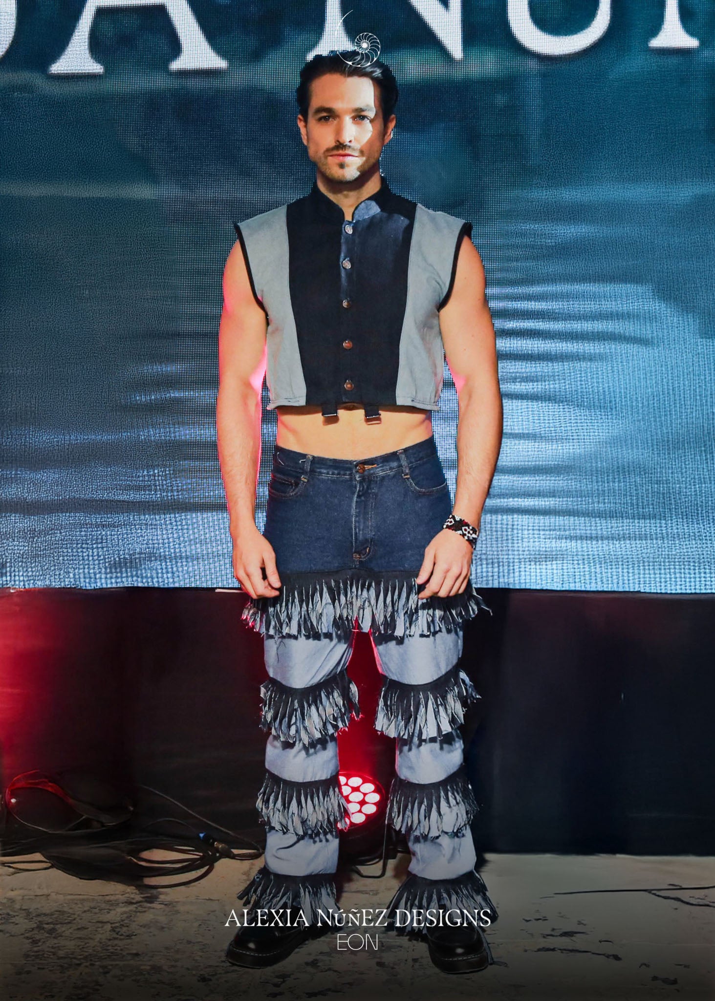 These theatrical full-length pants feature stacked ruffle tiers along the waist, thigh, knee, and ankle—each crafted from contrasting denim tones for layered texture and movement. The silhouette is anchored by a structured straight-leg underlayer and a soft denim waistband with belted detailing. Bold, expressive, and gender-fluid, this piece embodies upcycled couture.