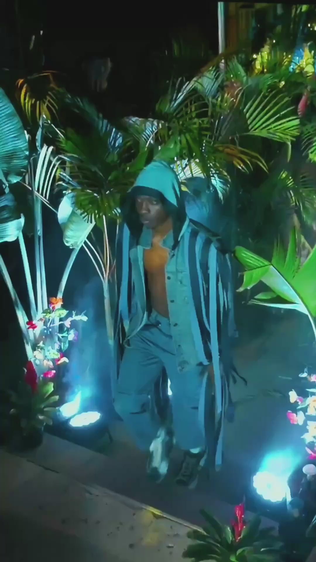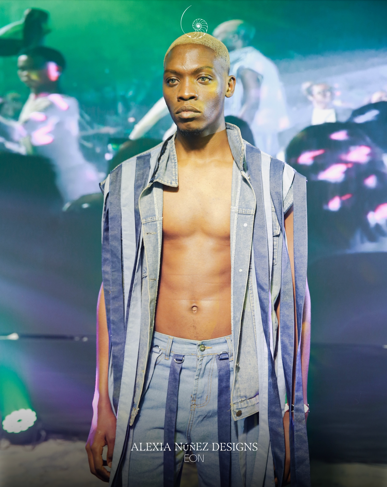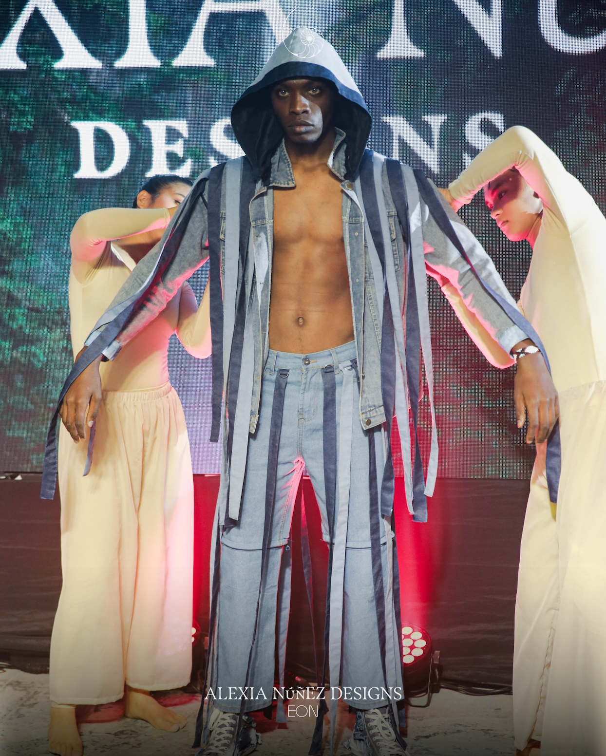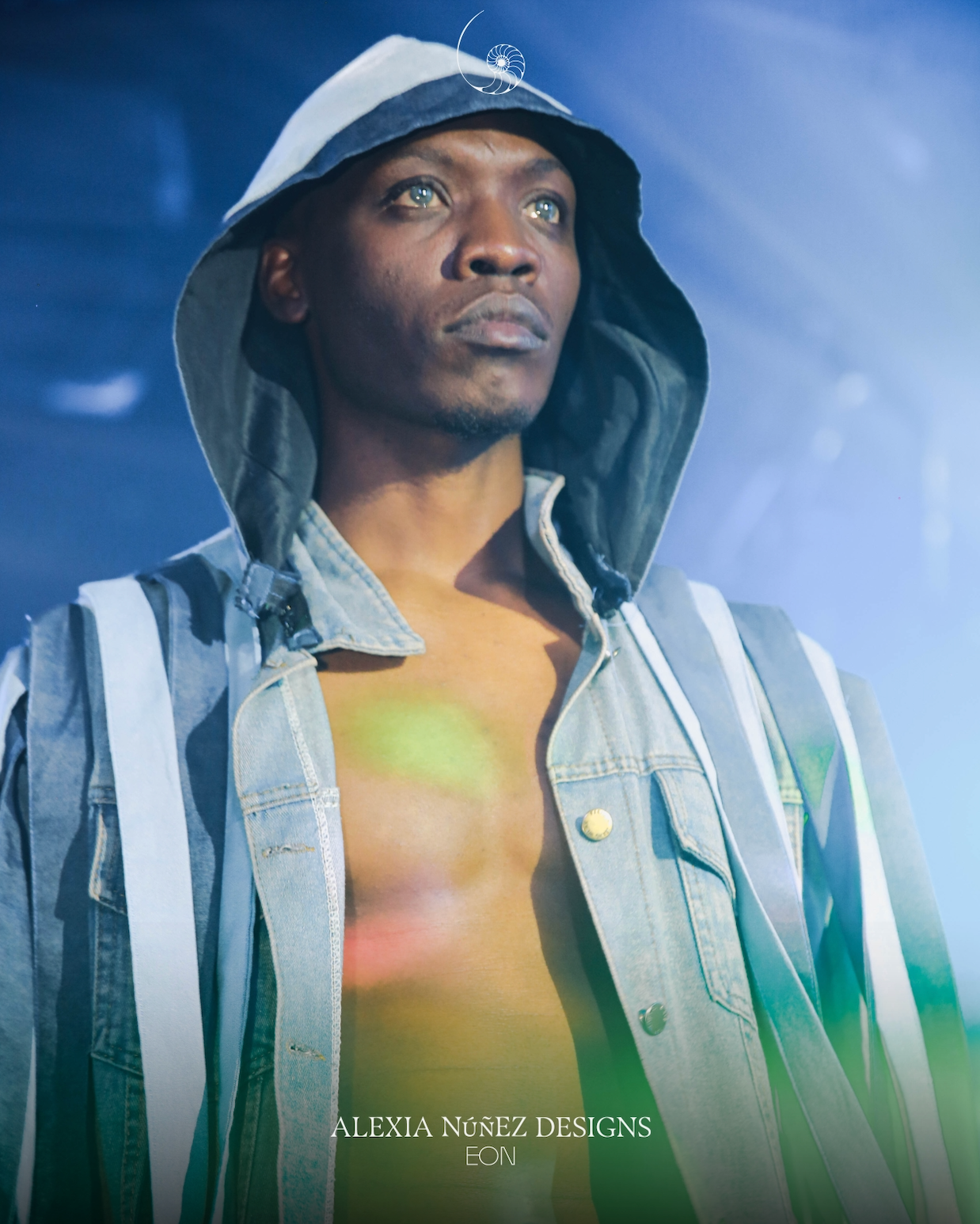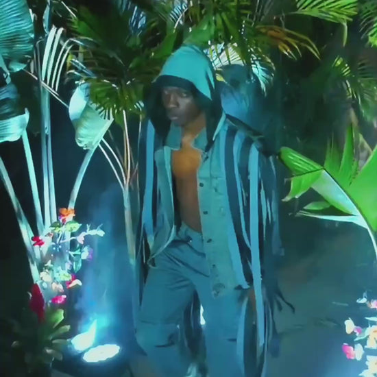 A genderless outerwear statement, this upcycled denim hooded jacket merges functionality with raw-edged drama. Designed with vertical paneling in varying denim tones, the piece features cascading detachable strips along the arms and sides, creating both movement and customizability. The oversized hood and sleeveless silhouette evoke both warrior and wanderer energy.