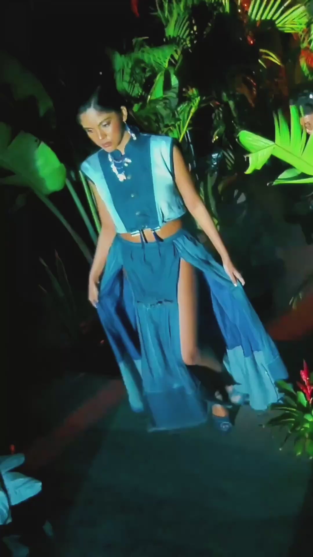 This transformative unisex top builds upon the signature Alexia Nunez silhouette—featuring a structured two-tone denim base with a high collar and central button closure. What sets it apart is its convertibility: detachable sleeves and a layered ruffle hem can be added or removed, shifting the look from a cropped statement top to a fuller, more dramatic torso piece. Each ruffle is handcrafted from reclaimed denim in tonal gradients, honoring craftsmanship and function in equal measure.